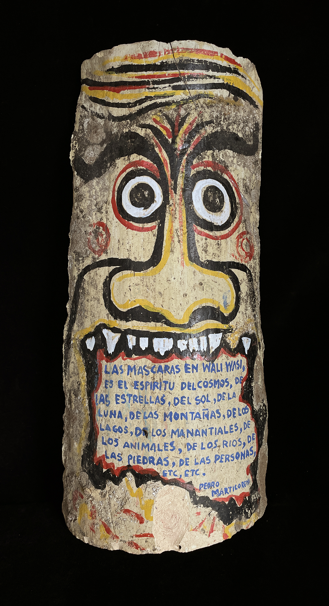 On one mask the artist wrote: "THE MASKS IN WALI WASI, ARE THE SPIRIT OF THE COSMOS, OF THE STARS, OF THE SUN, OF THE MOON, OF THE MOUNTAINS, OF THE LAKES, OF THE SPRINGS, OF THE ANIMALS, OF THE RIVERS, OF THE STONES, OF THE PEOPLE, ETC., ETC. PEDRO MARTICORENA"