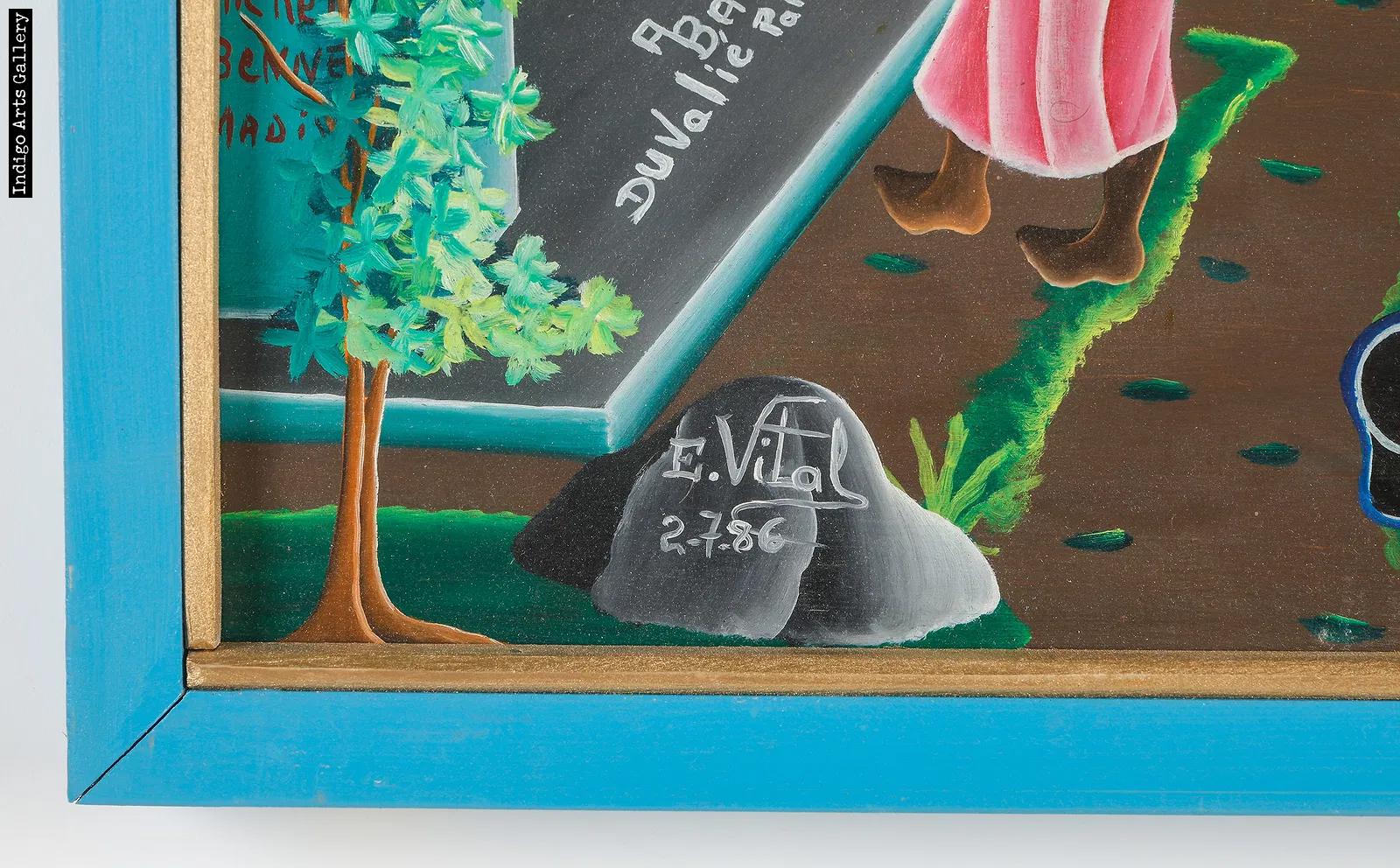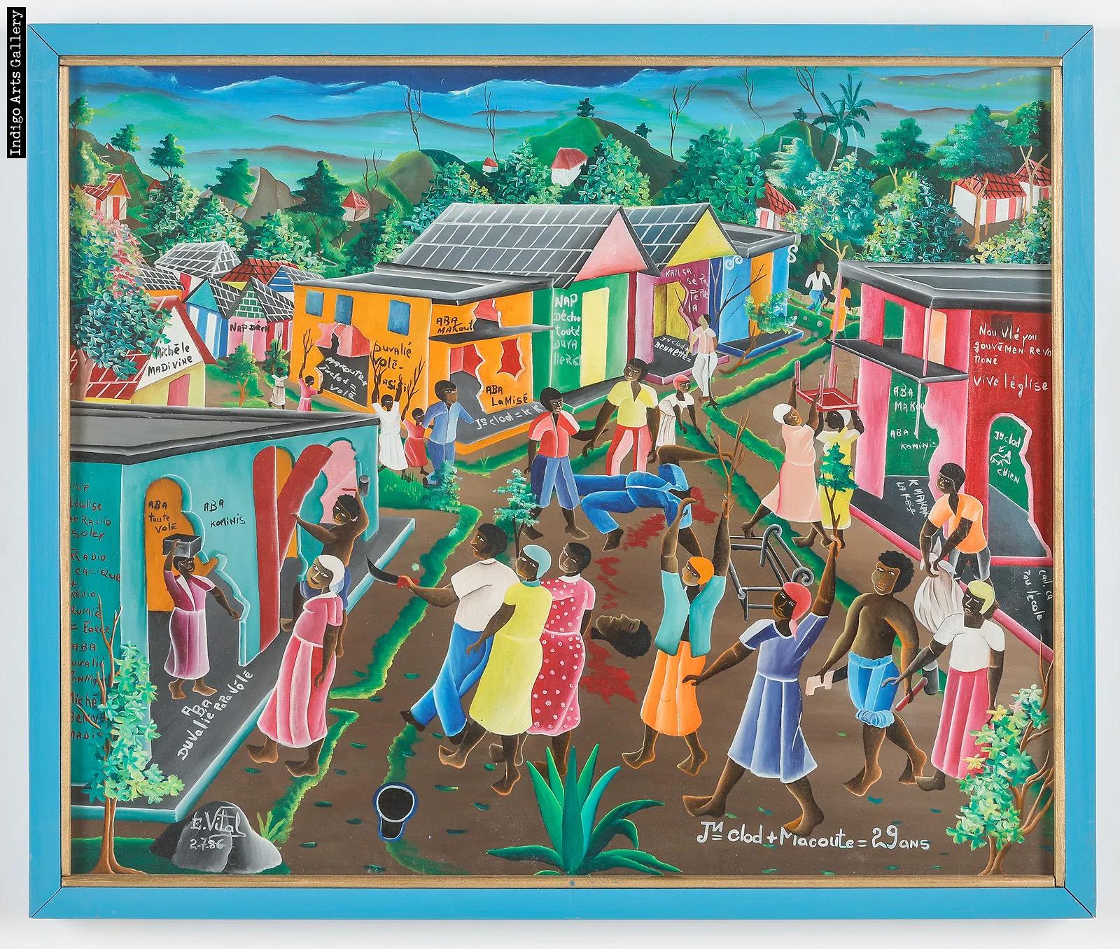 Note: The phrase "Jn Clod + Makout = 29 Ans" refers to the long and oppressive reign of Jean-Claude Duvalier and his father Francois "Papa Doc" Duvalier, which has just beennoverturned in 1986. The scene depicts some of the revenge and bloodletting, called "Dechoukaj", meaning "uprooting" in Kreyol, which followed.