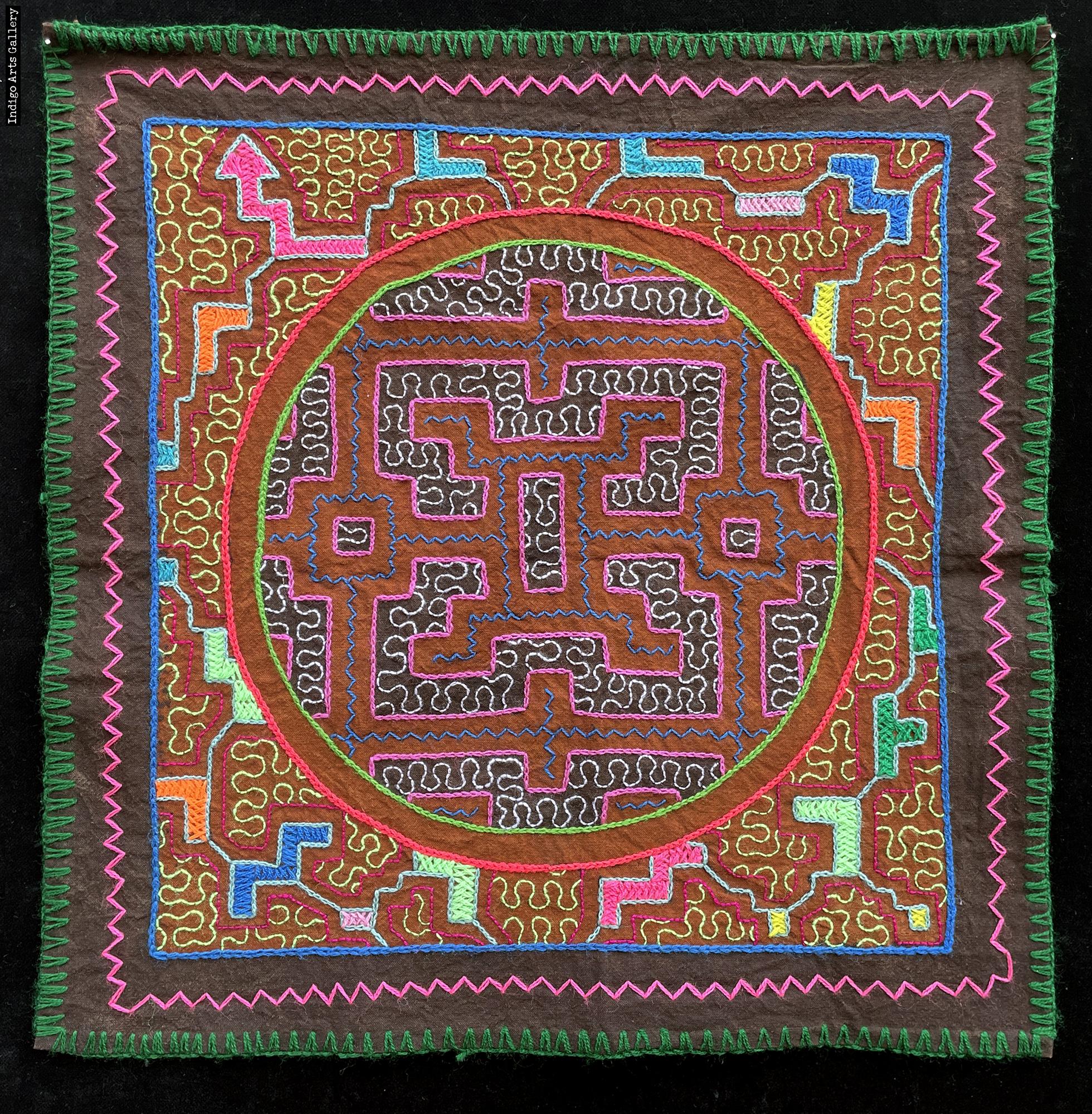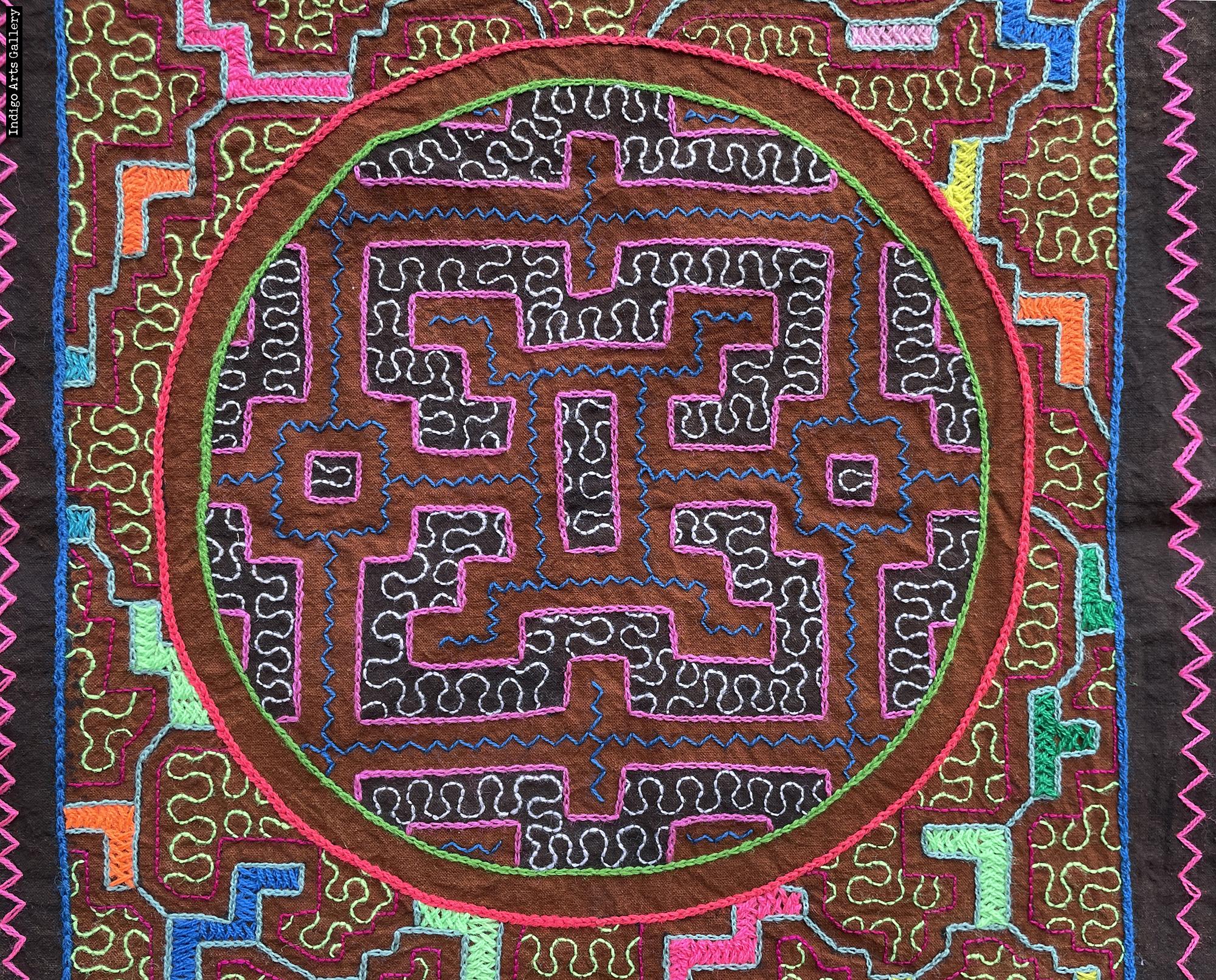 Cotton fabric with natural dyes and cotton and synthetic yarn embroidery design.