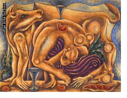 Biography - José Eddie Martinez is from Juchitan in the hot, lowland Isthmus of Tehuantepec region of Oaxaca, where he was born in 1963. He studied at the Taller de Artes Plasticas Rufino Tamayo under Roberto Donis, and continued his studies with Juan Alcazar at the Taller Libre de la Grafica Oaxaquena. Eddie Martinez’s enigmatic and often dark prints and paintings have been featured in several solo shows in Oaxaca, as well as group shows in both the United States and Mexico, such as the touring Life, Legend and Dreams show in 1990. His work is included in such public collections as the Museo de Arte Contemporaneo Latino Americano in Uruguay, and the Nelson Center for the Arts at Arizona State University.