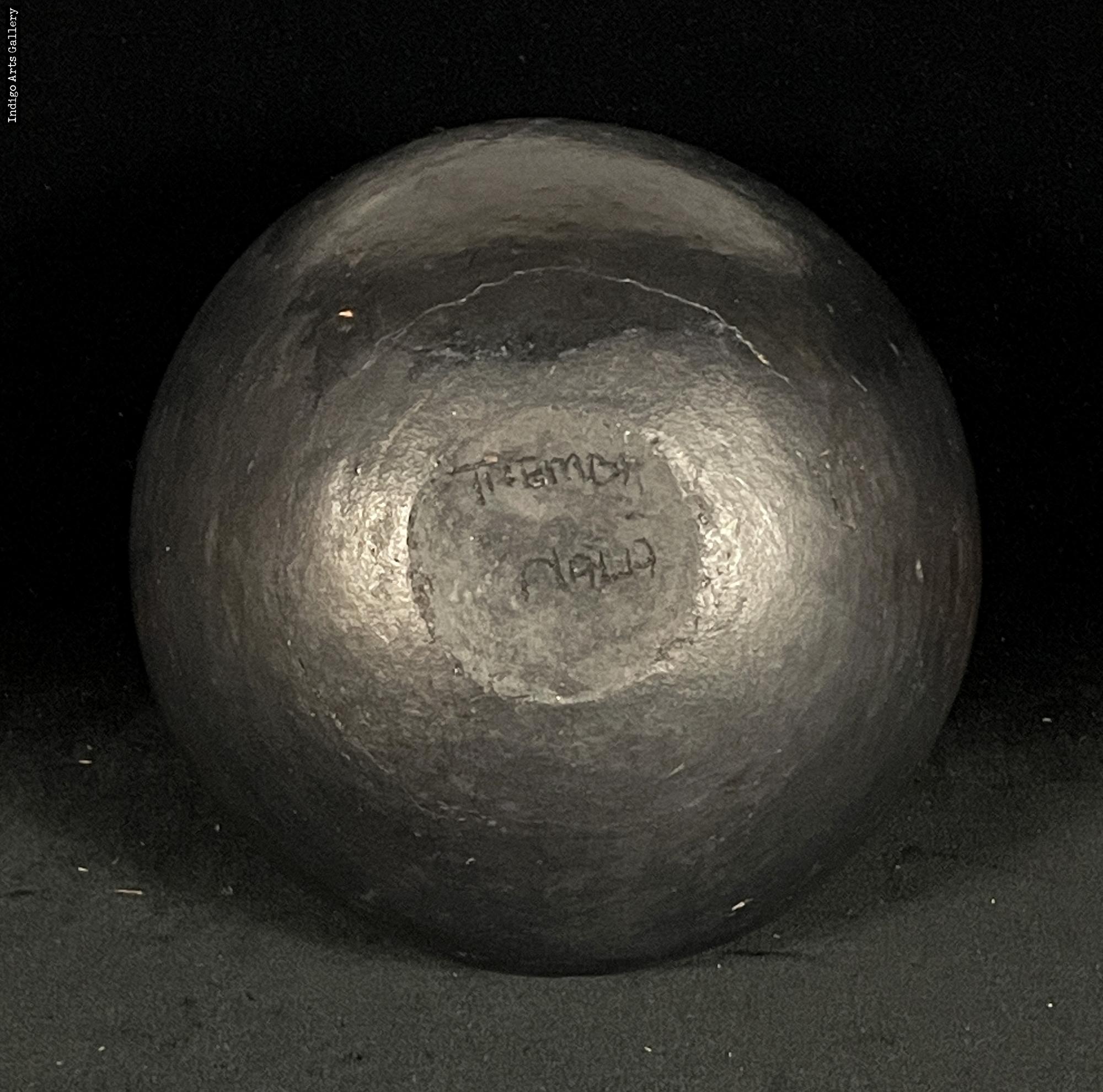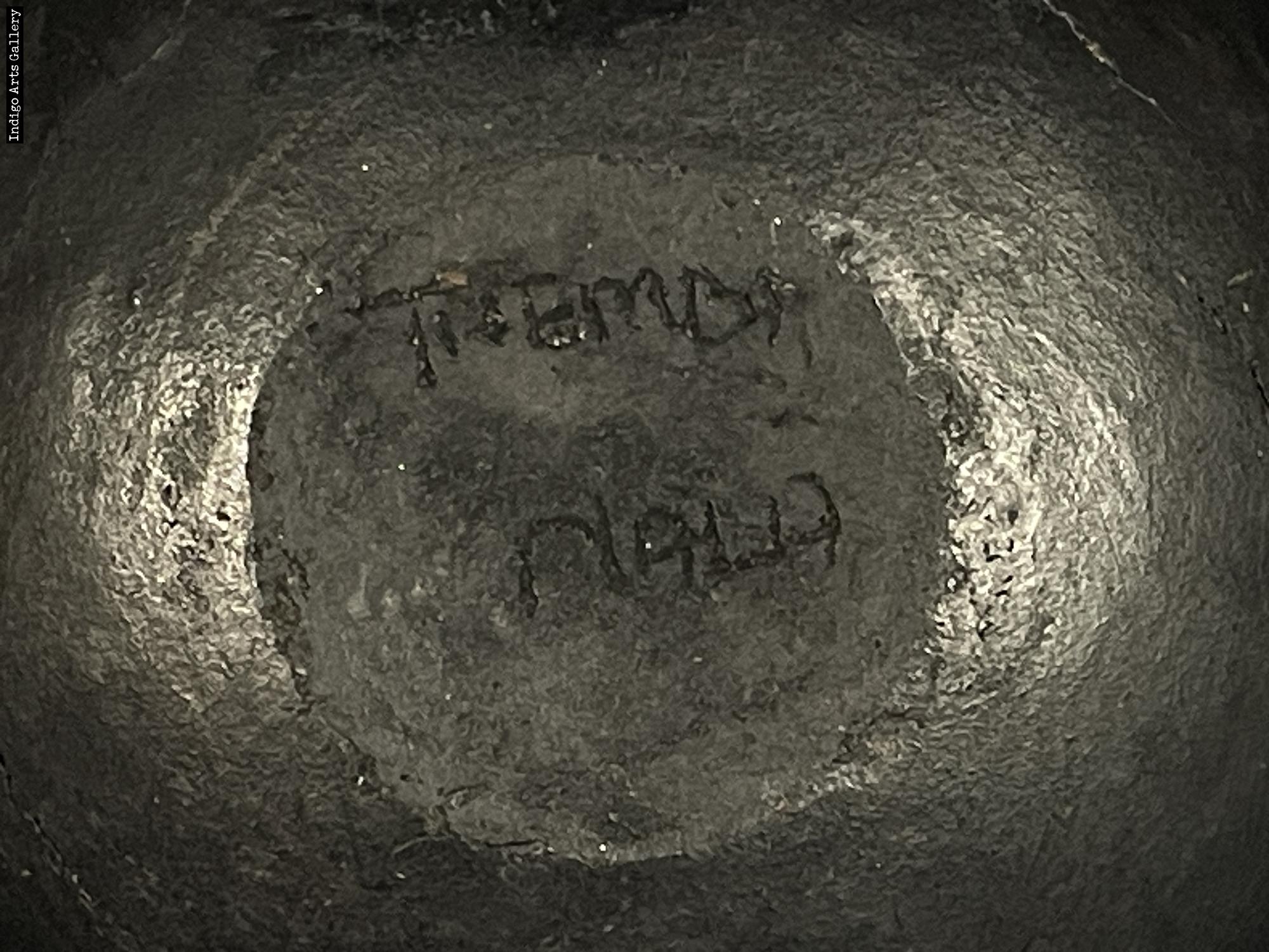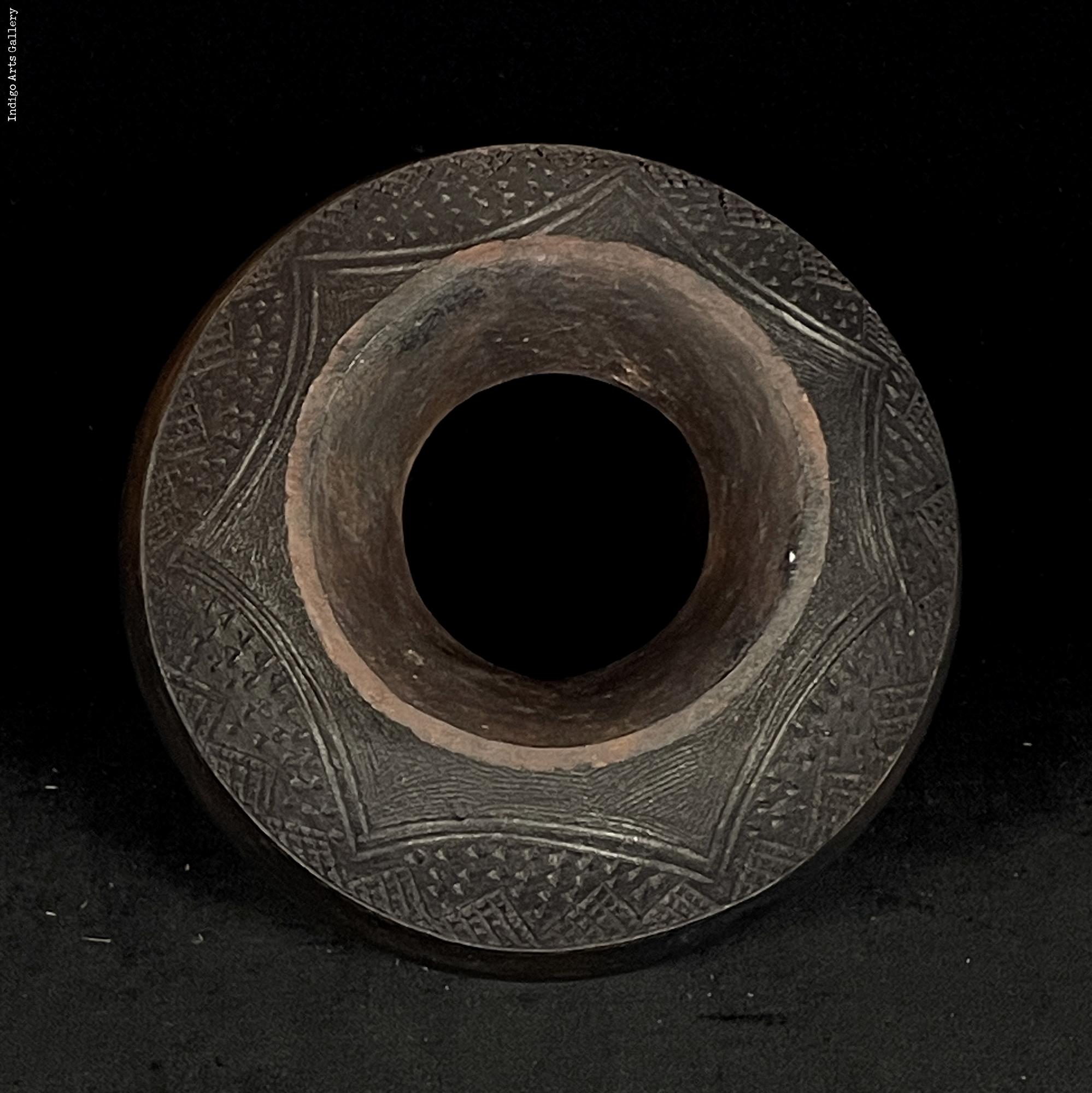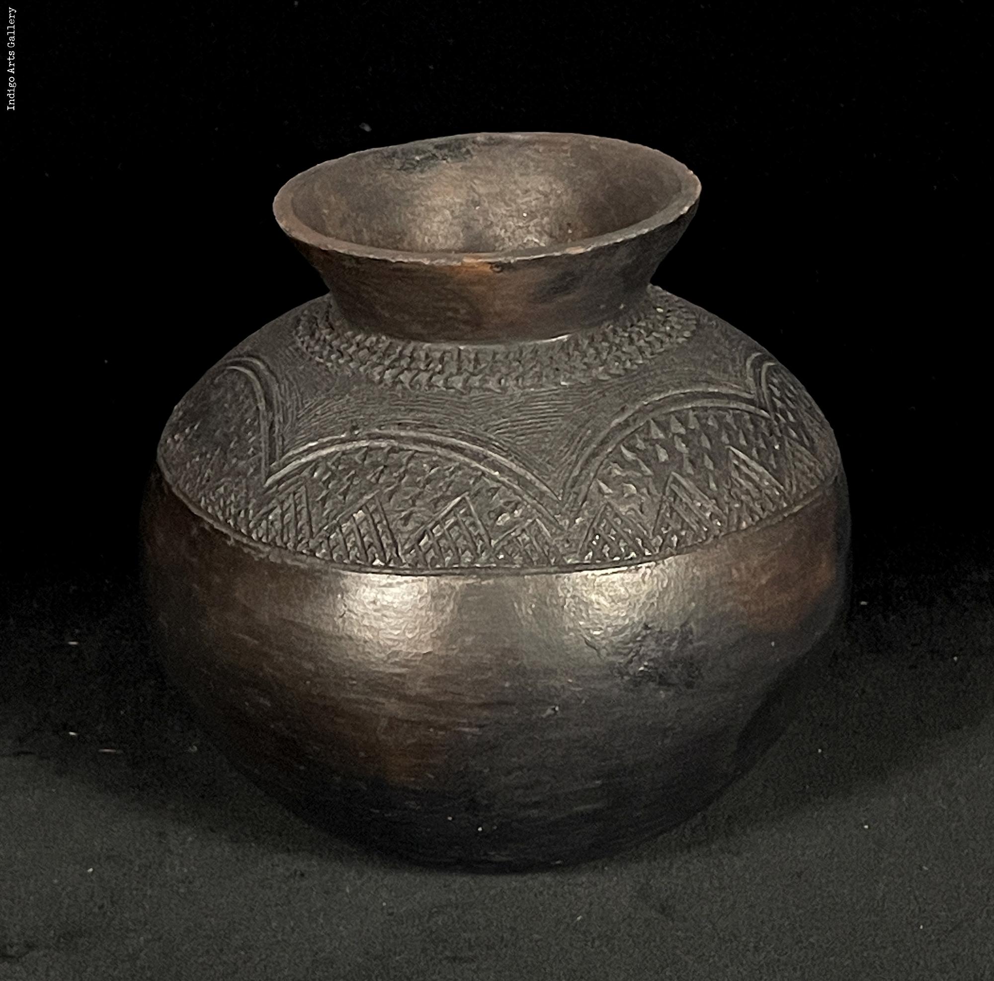 Hand-coiled clay pot with incised and relief decoration, glazed with animal fat.