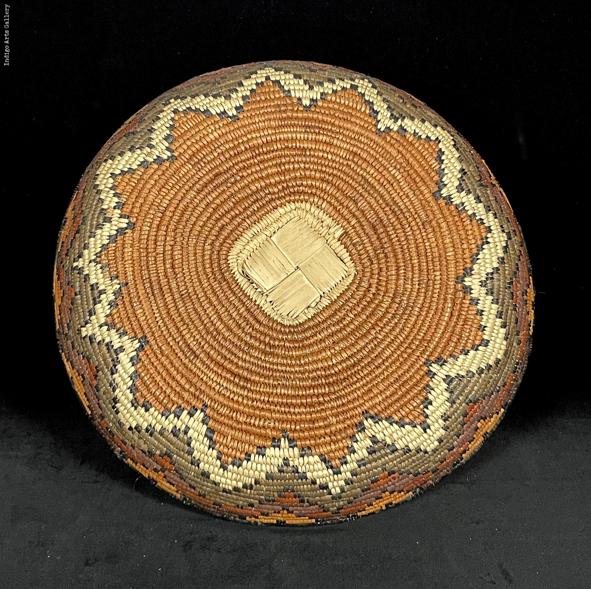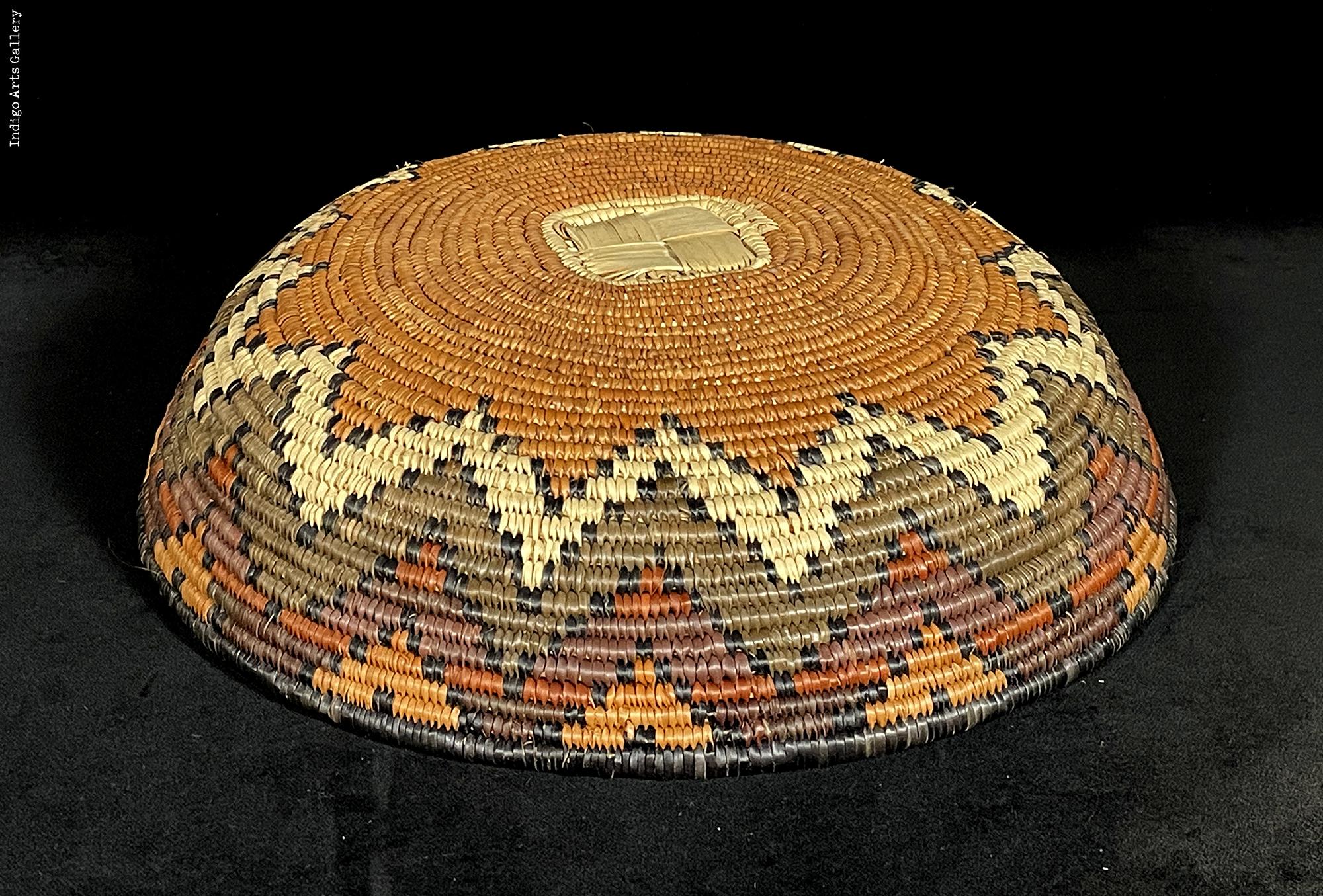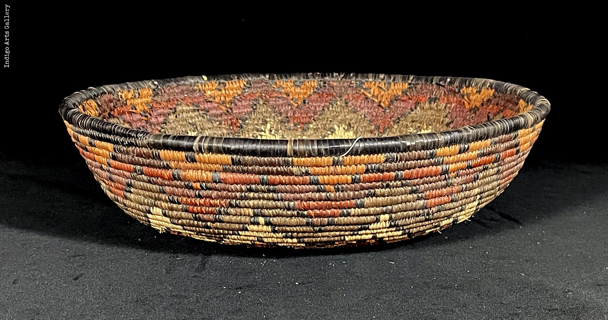 Ilala palm and grass open bowl basket. Fibers dyed with indigenous vegetable dyes (3” h. x 10.75” diameter).