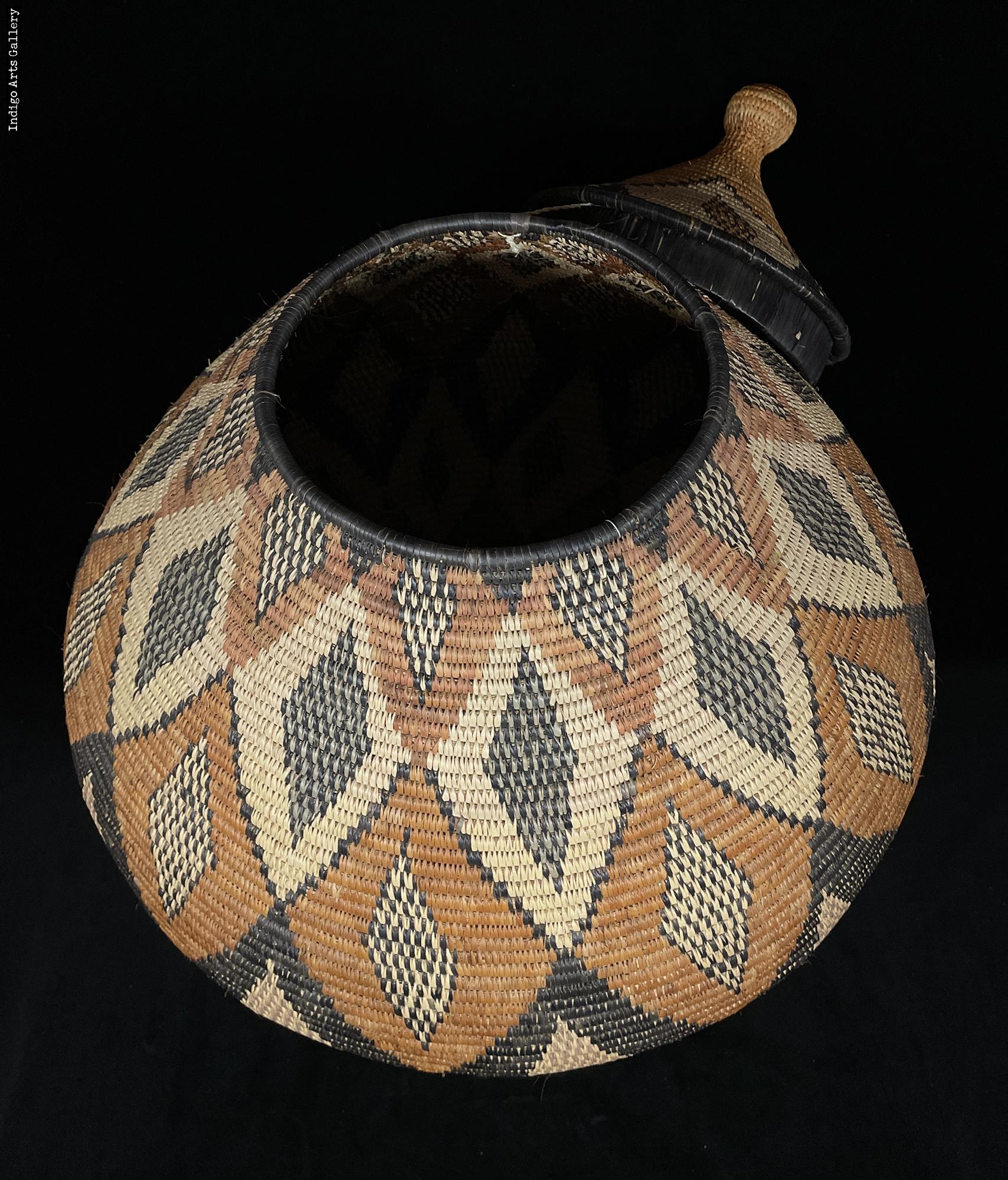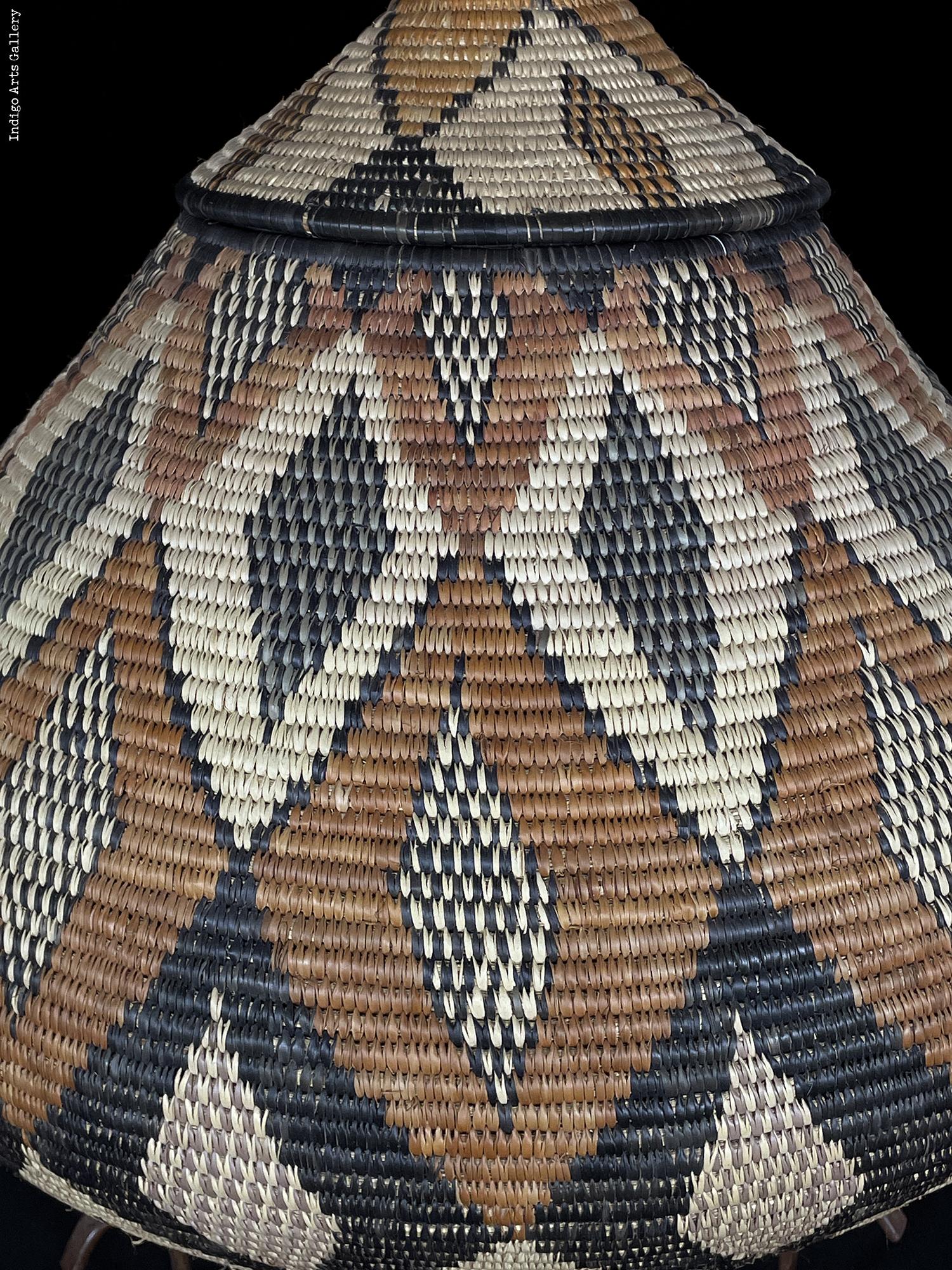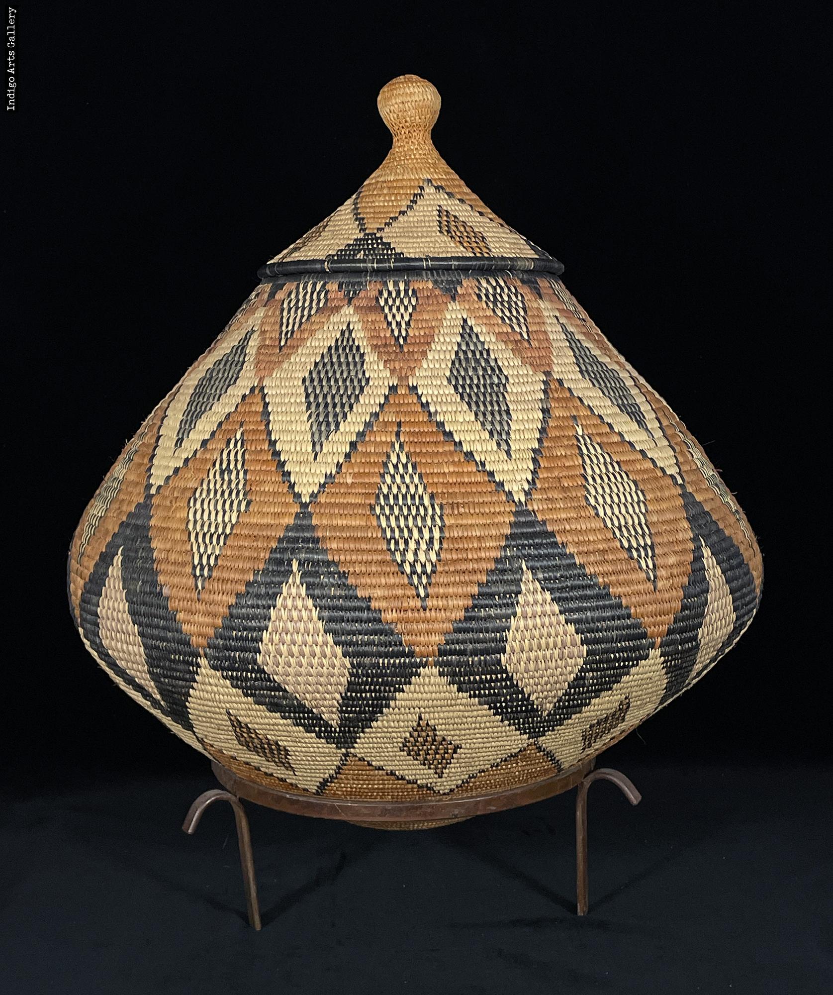 Ilala palm and grass 'ukhamba' beer basket with lid. Fibers dyed with indigenous vegetable dyes (22" high, including lid x 20" diameter).